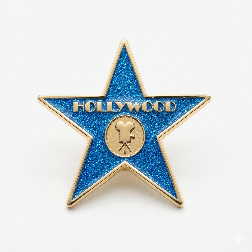 A premium, star-shaped keepsake celebrating the cinematic history of Tinseltown. This pin features a striking glitter finish designed to capture the glamour of the Walk of Fame.